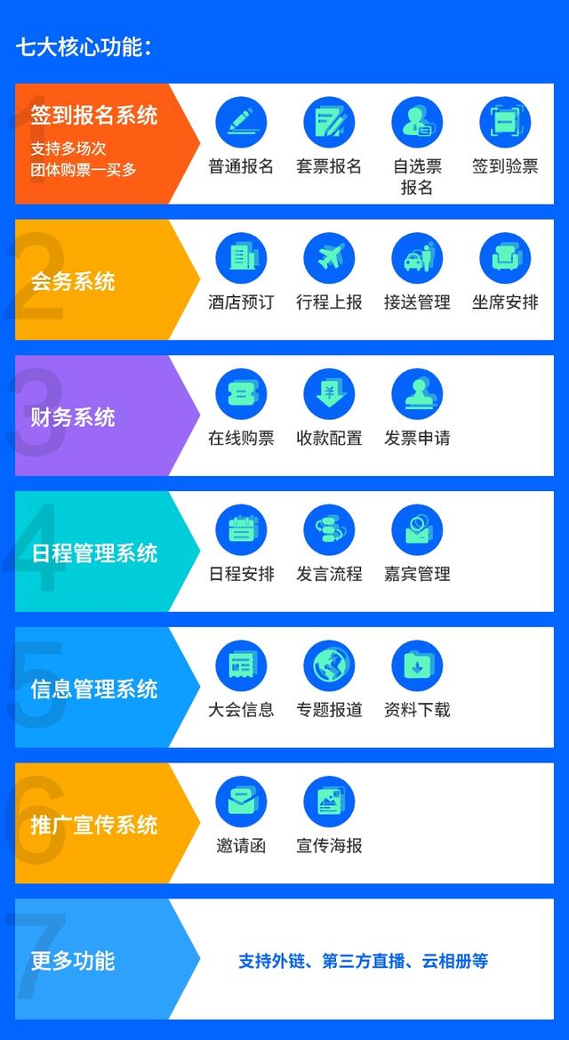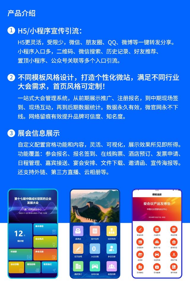 · 微站集成:一站式报名、信息展示(概况、日程、嘉宾、展品),支持发票申请,提升宣传效果。